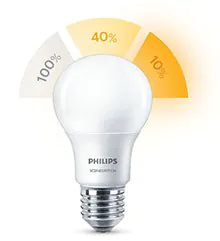Le lampadine Philips SceneSwitch LED consentono di passare da una luce più intensa a una più calda e soffusa senza l'utilizzo di un dimmer. Basta utilizzare l'interruttore della luce per poter sfruttare tutti i vantaggi di queste lampadine, senza dover installare niente o apportare modifice all'impianto elettrico. Inoltre, un chip di memoria integrato permette di memorizzare l'ultima impostazione luminosa scelta dopo che si spegne la luce. Nel caso in cui si utilizzino più lampadine e si desideri ripristinare le impostazioni predefinite basterà spegnerle e riaccenderle entro un secondo.