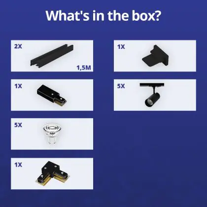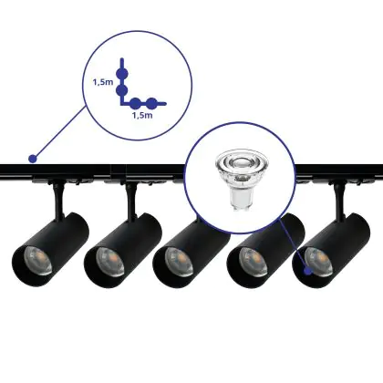 Descrizione Set completo 1-Fase Rail L 1,5 x 1,5 Metro Nero | incl. 5x Faretti + GU10 2700K 3W Dimmerabile + Tappo Di Chiusura, Connettore di Alimentazione e L -Connettore